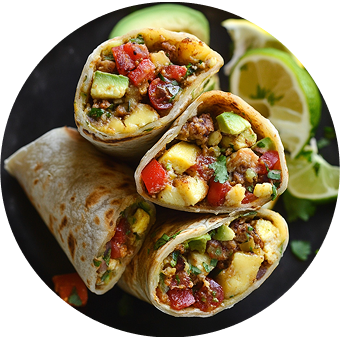 Hickory smoked bacon, apple pork sausage or chorizo, fluffy scrambled eggs, sharp cheddar, sweet peppers, caramelized onion in fresh 13in flour tortilla. Served with our 3 ingredient.