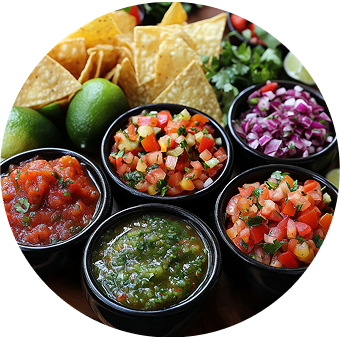 Salsa trio: OG 3 ingredient, dill pickle hot sauce, Mexico city blanco, smashed avocado, Mexican fruit cart salad