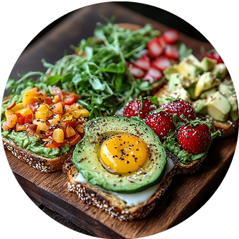 Grilled sourdough, smashed avocados, pomegranate seeds, everything bagel seasoning, cotija cheese, pepitas, diced tomato, shaved red onion and sliced eggs