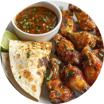 Elote shooters, quesadillas with pico de gallo, cilantro lime smoke chicken wings